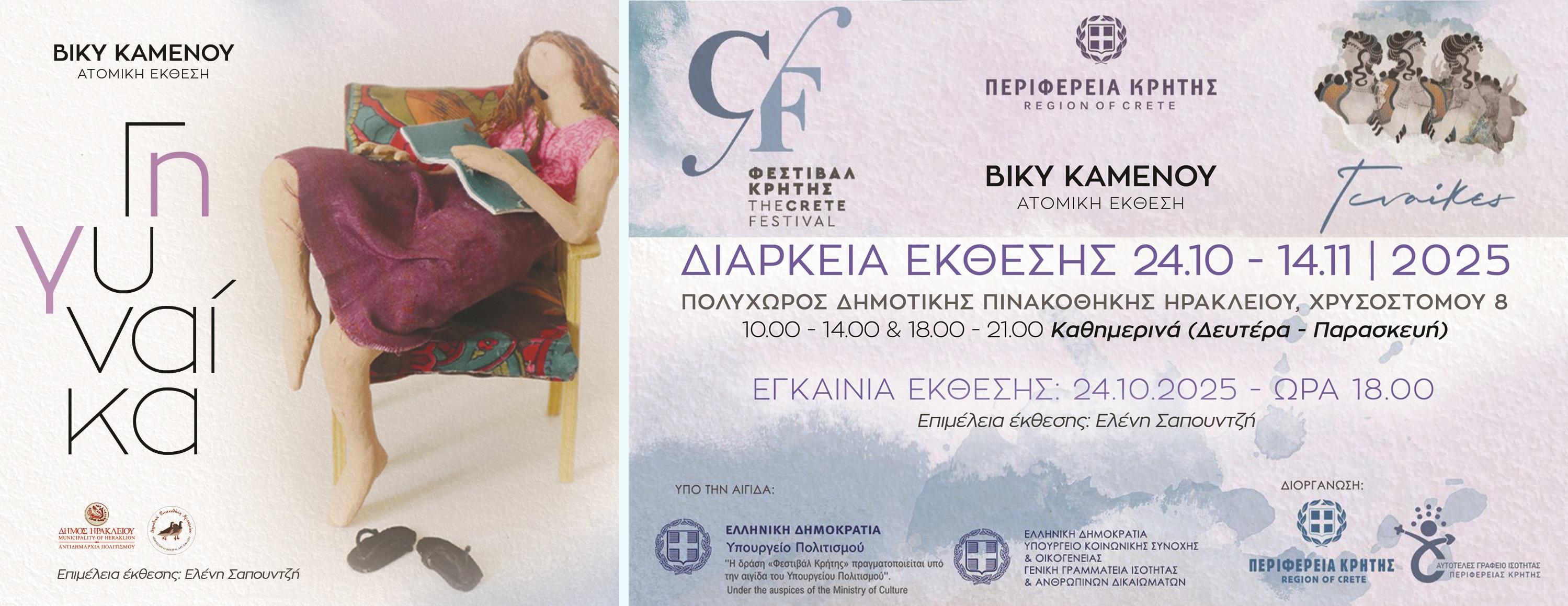 Πολυχώρος – Γκαλερί Δημοτικής Πινακοθήκης Ηρακλείου Χρυσοστόμου 8 , Ηράκλειο  Παρασκευή 24 Οκτωβρίου – Παρασκευή 11 Νοεμβρίου 2025  «Γη-Γυναίκα», είναι ο τίτλος της ατομικής έκθεσης της Βίκυς Καμένου, που θα παρουσιαστεί στη Δημοτική Πινακοθήκη Ηρακλείου στην οδό Χρυσοστόμου 8 από τις 24/10/202 έως τις 14/11/2025 στο πλαίσιο της παράλληλης δράσης του 5ου Φεστιβάλ Κρήτης «Γυναίκες», που υλοποιείται για 2η συνεχόμενη χρονιά, […]