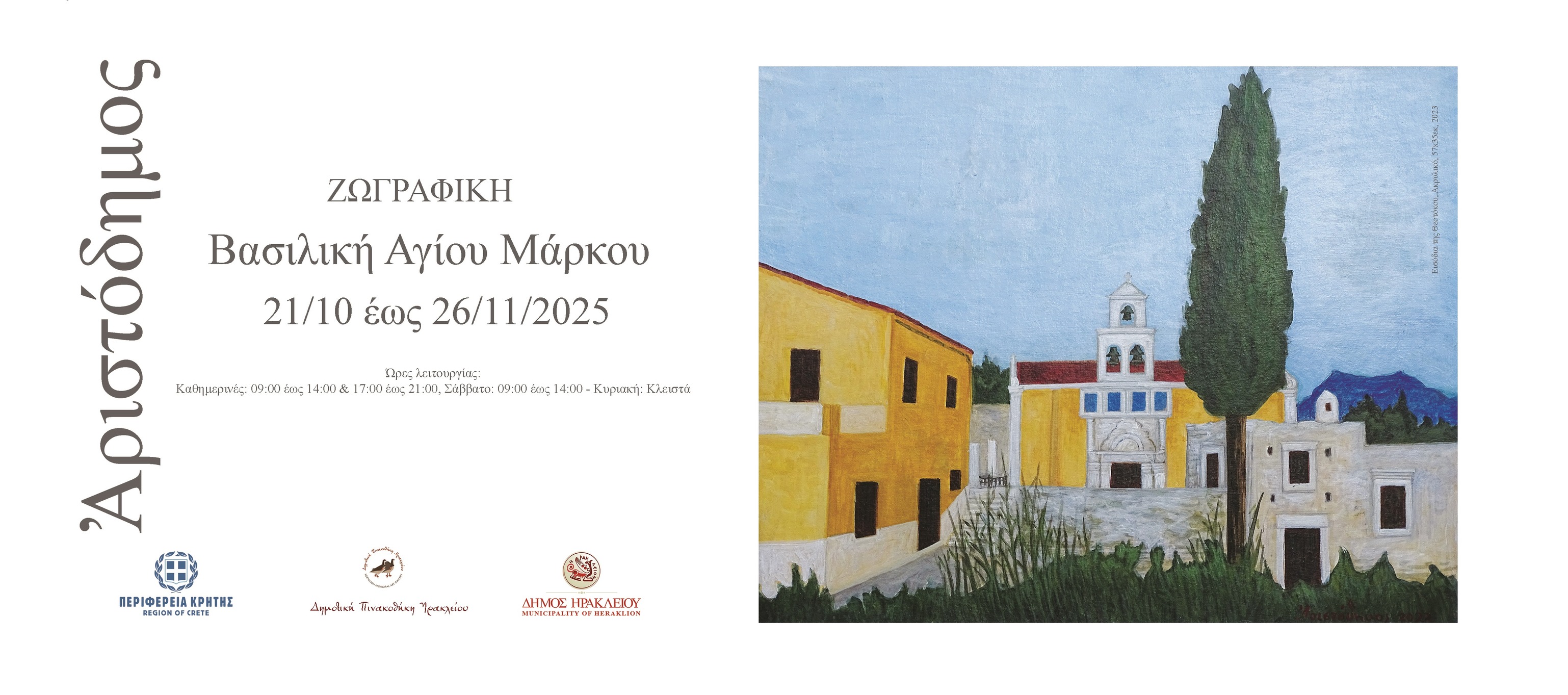 Βασιλική Αγίου Μάρκου – Δημοτική Πινακοθήκη Ηρακλείου Διάρκεια έκθεσης:  Τρίτη 21 Οκτωβρίου – Τετάρτη 26 Νοεμβρίου 2025 Έργα ζωγραφικής του Αριστόδημου θα φιλοξενηθούν στην Βασιλική του Αγίου Μάρκου- Δημοτική Πινακοθήκη Ηρακλείου, από την Τρίτη 21 Οκτωβρίου μέχρι και την Τετάρτη 26 Νοεμβρίου  2025, σε συνδιοργάνωση του Δήμου Ηρακλείου – Δημοτικής Πινακοθήκης και της Περιφέρειας Κρήτης. […]