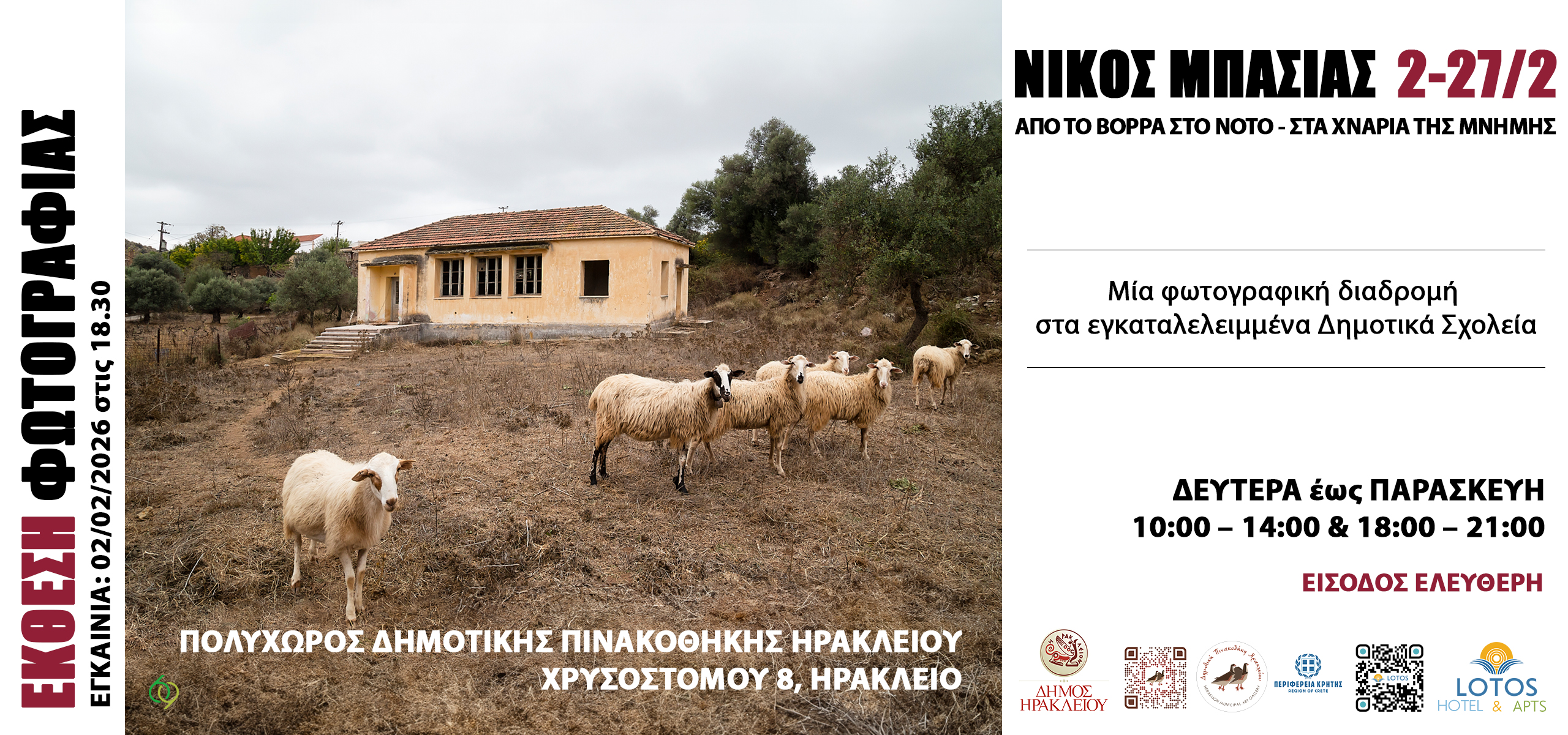 Διάρκεια έκθεσης: Δευτέρα 2 – Παρασκευή 27 Φεβρουαρίου 2026 Εγκαίνια Έκθεσης: Δευτέρα 2 Φεβρουαρίου 2026 Πολυχώρος – Γκαλερί Δημοτική Πινακοθήκη Ηρακλείου Ο Πολυχώρος – Γκαλερί της Δημοτικής Πινακοθήκης Ηρακλείου παρουσιάζει την ατομική έκθεση του βραβευμένου σε διεθνές και εθνικό επίπεδο φωτογράφου και εικαστικού Νίκου Μπασιά, ένα μοναδικό ταξίδι στον χώρο και τον χρόνο των δημοτικών […]