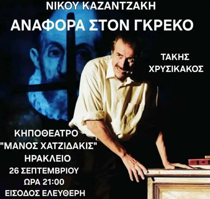 Μια μοναδική παράσταση, η «Αναφορά στον Γκρέκο», σε διοργάνωση της Περιφέρειας Κρήτης, παρουσιάζεται στο Ηράκλειο, σε συνεργασία με τις Εκδόσεις Διόπτρα, την αιγίδα του Μουσείου Νίκου Καζαντζάκη, για να τιμήσει το έργο του μεγάλου Κρητικού συγγραφέα.