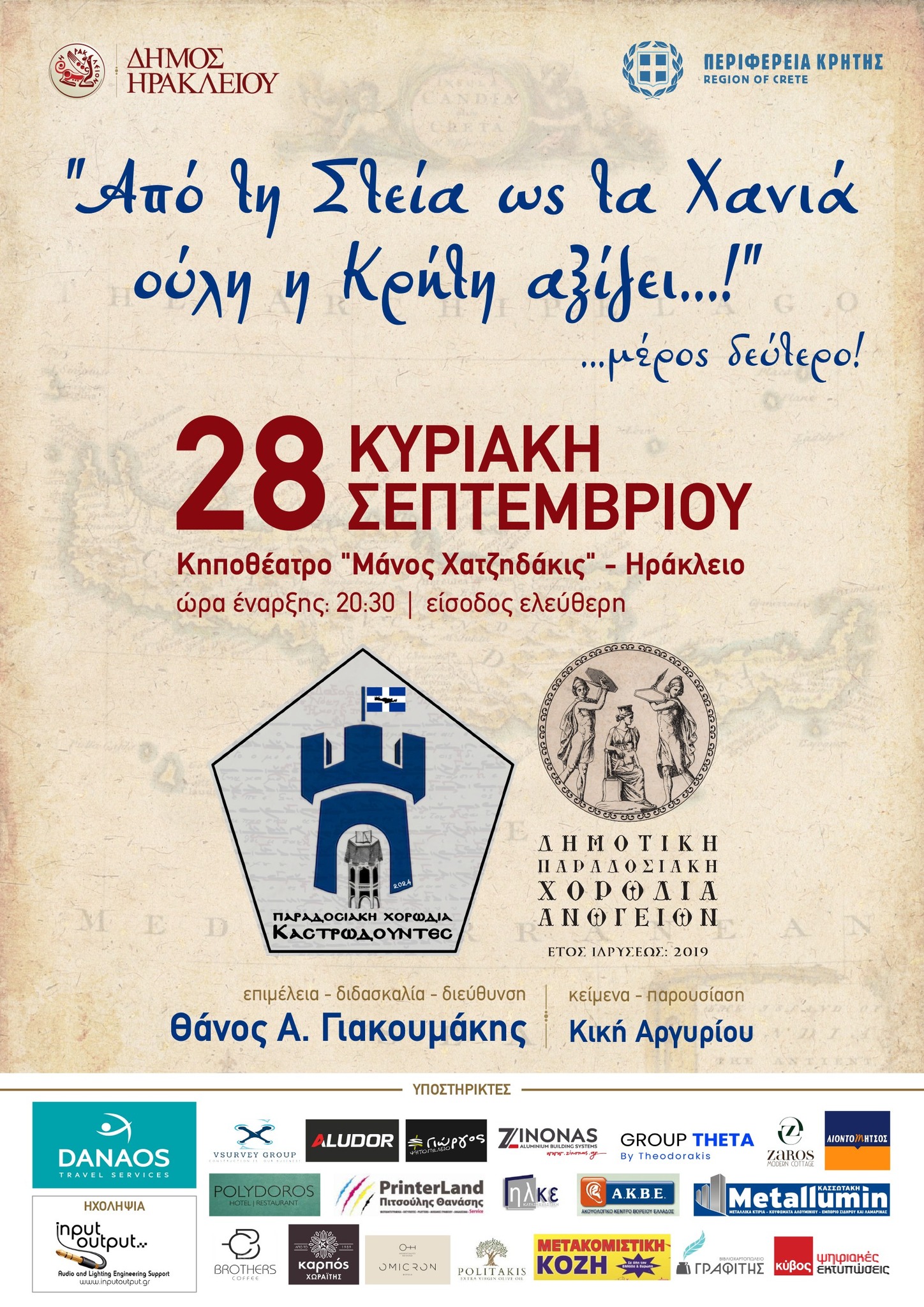 Μια μουσική σύμπραξη της Μικτής Παραδοσιακής Χορωδίας «Καστρωδούντες» με την Δημοτική Παραδοσιακή Χορωδία Ανωγείων στην οποία θα παρουσιαστούν τραγούδια της Κρήτης σε πρωτότυπες χορωδιακες εκτελέσεις.