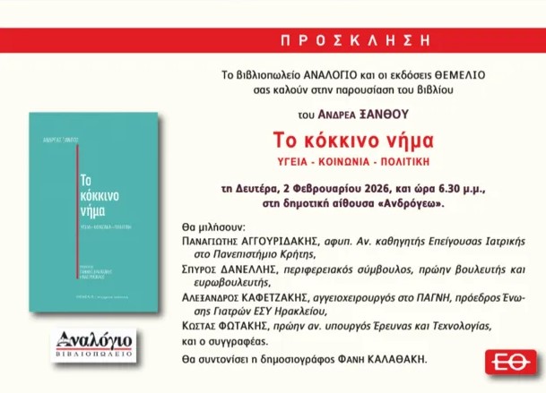 Το βιβλίο του Ανδρέα Ξανθού με τίτλο «Το κόκκινο νήμα – Υγεία, Κοινωνία, Πολιτική» παρουσιάζεται τη Δευτέρα 2 Φεβρουαρίου 2026, στις 6.30 μ.μ., στη δημοτική αίθουσα “Ανδρόγεω” στο Ηράκλειο.