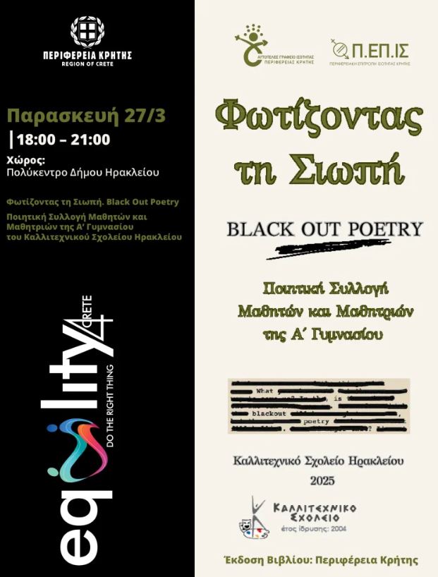 Η Περιφέρεια Κρήτης, σε συνεργασία με το Καλλιτεχνικό Σχολείο Ηρακλείου, με αφορμή την Παγκόσμια Ημέρα Ποίησης, διοργανώνουν την παρουσίαση της ποιητικής συλλογής μαθητών και μαθητριών της Α’ Γυμνασίου, με τίτλο «Φωτίζοντας τη Σιωπή–Black Out Poetry», την Παρασκευή 27 Μαρτίου 2025, από τις 18:00 έως τις 21:00, στο Πολύκεντρο του Δήμου Ηρακλείου.